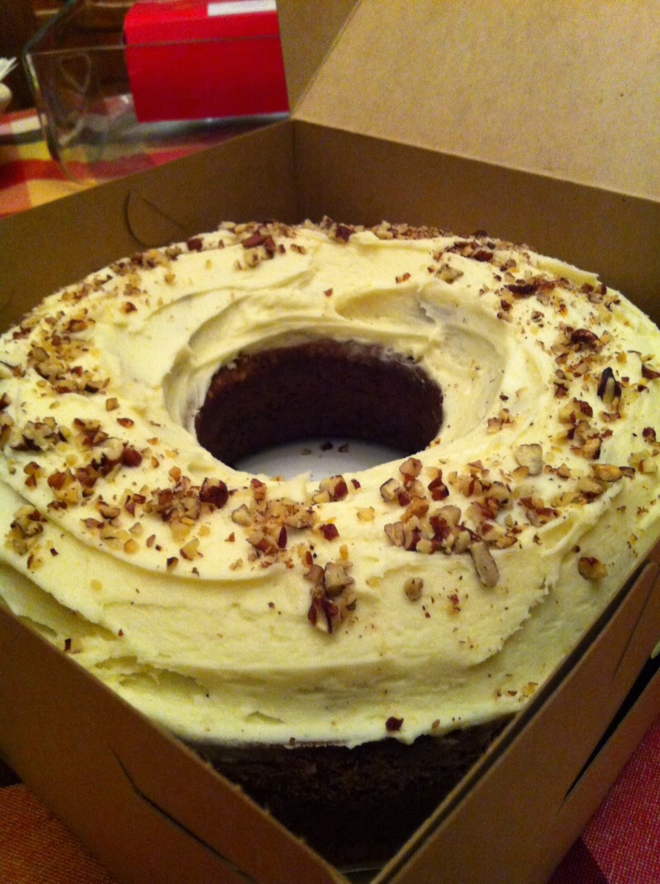 about it, with copious amounts of tangy cream cheese icing and crushed pecans